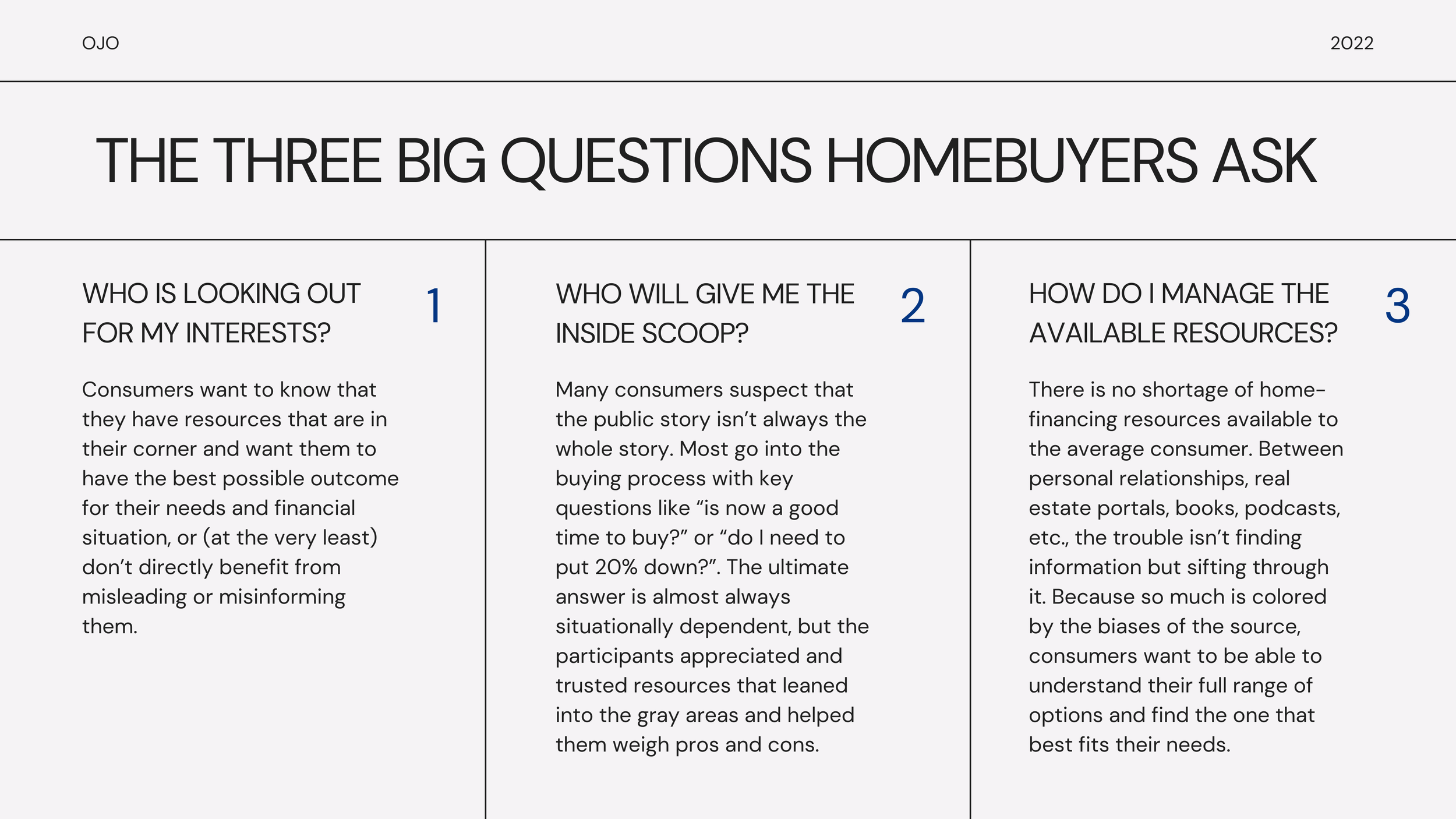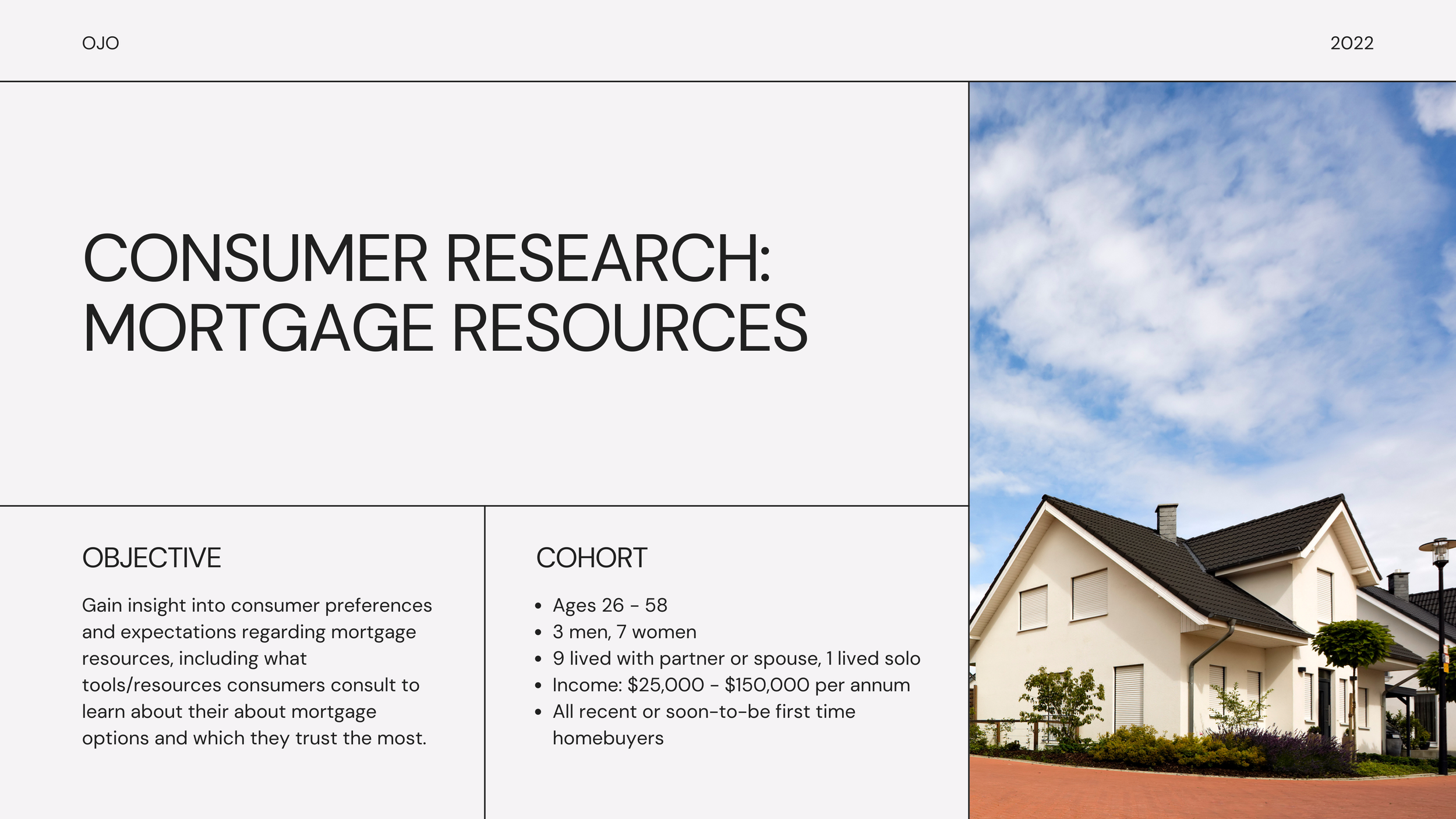 In addition to my work with the agent network at OJO, I also had the opportunity to work on several agent and consumer insights initiatives. The following report discusses my findings from a qualitative research project I organized and conducted to understand how US homebuyers went about educating themselves on home financing topics and who they trusted along the way.