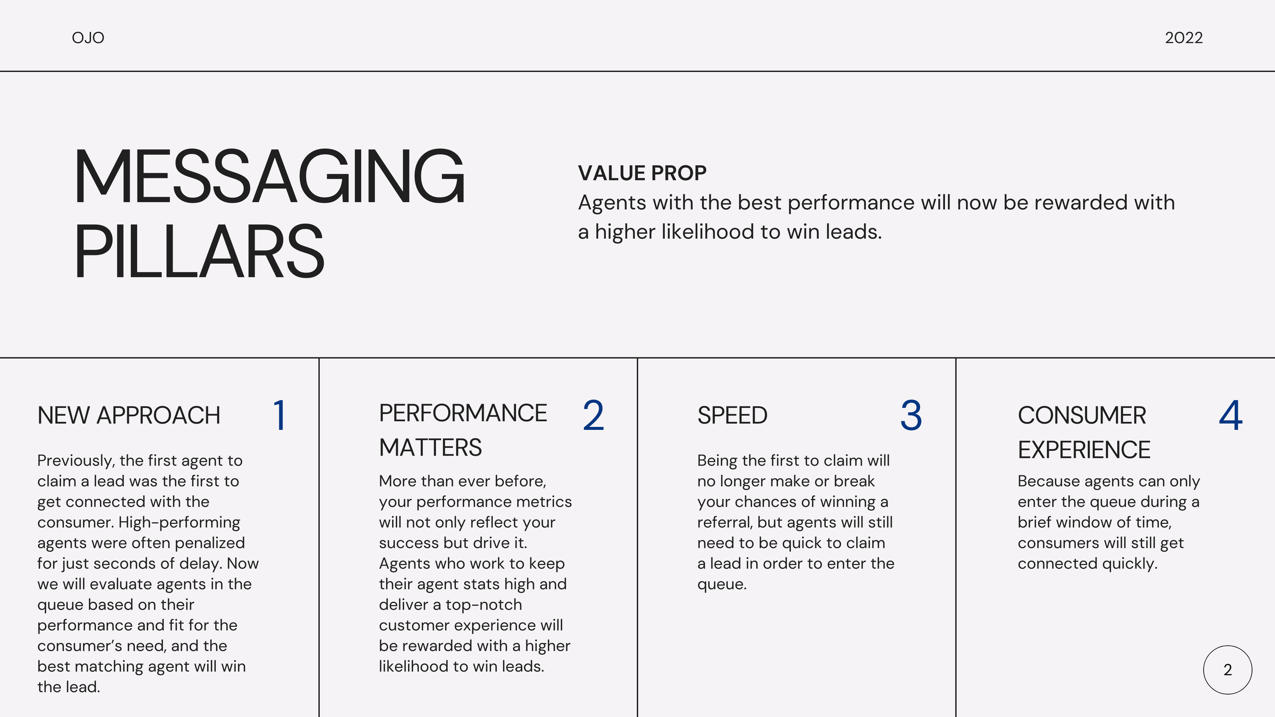 Messaging is key to the success of a launch, no matter the size. The examples below demonstrate how I translated feature changes in the OJO Agent Dashboard into a series of messaging pillars and a suite of copy deliverables.