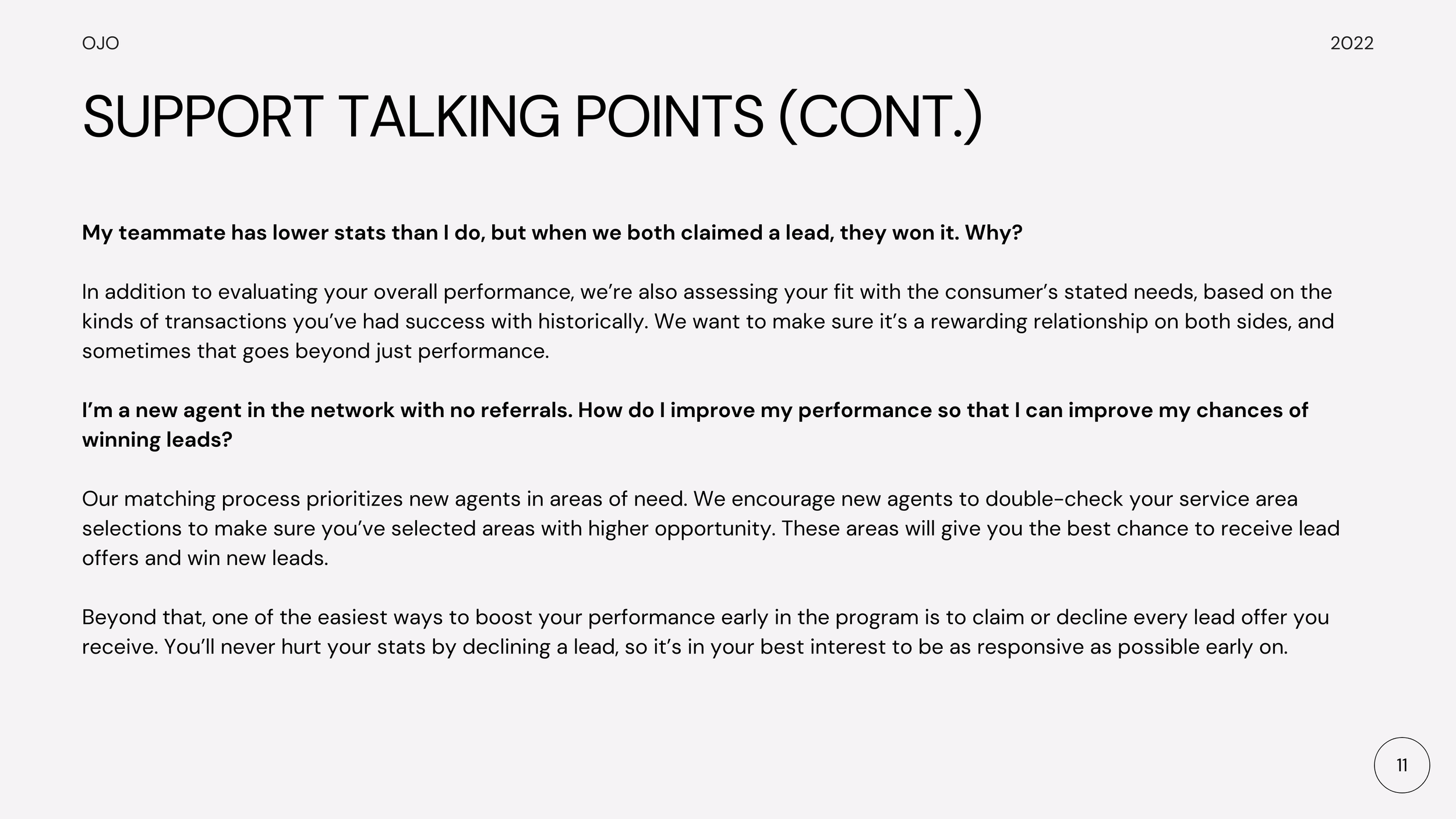 The samples below draw mostly from my work with the OJO Select Network, a group of 20,000 partner real estate agents across the US and Canada. My primary focus was driving compliance and adoption for our proprietary OJO Agent Dashboard, a web application that helped agents keep track of the referrals they received from us and monitor their performance in the network.